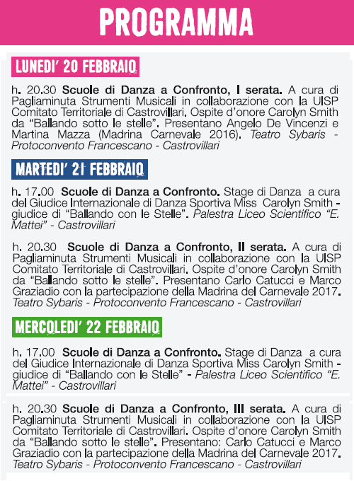 E’ giunta alla XXIII edizione “ Scuole di danza a confronto”, la manifestazione, inserita nel variegato cartellone del 59 Carnevale di Castrovillari e Festival Internazionale del Folklore.